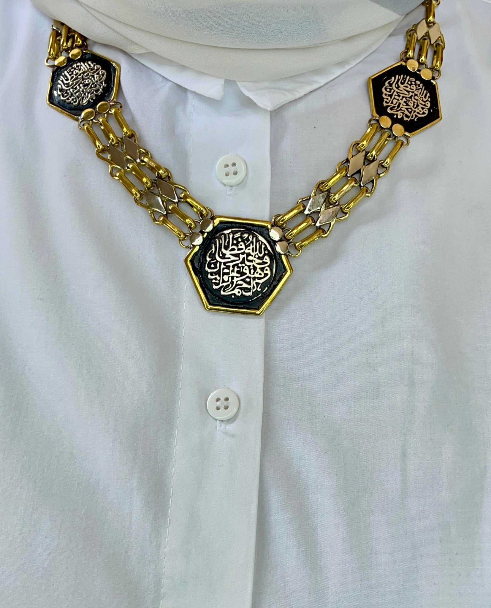 A statement of faith and elegance — this handcrafted Arabic jewelry set beautifully blends spiritual meaning with artistic design. The phrase “الله خير حافظاً وهو أرحم الراحمين” (“Allah is the Best Protector, and He is the Most Merciful of the merciful”) is gracefully engraved in traditional Arabic calligraphy, making it a timeless piece that reflects both style and spirituality. Perfect for those who appreciate meaningful beauty rooted in heritage.