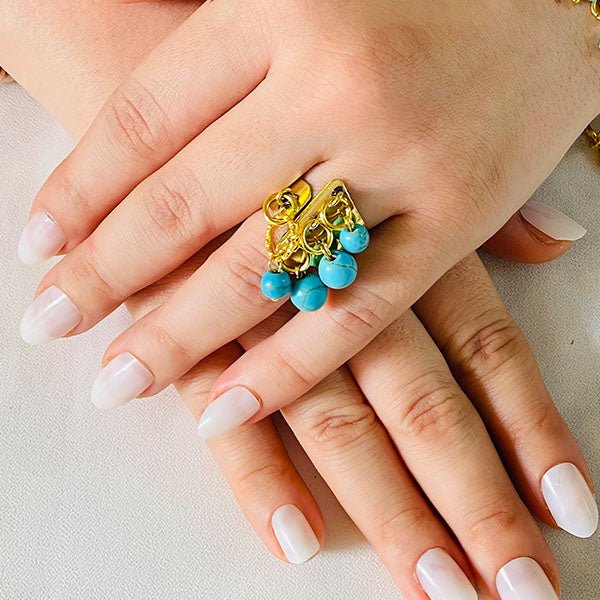 - The mix of turquoise, green agate, and golden feathers symbolizes balance, harmony, and creativity.