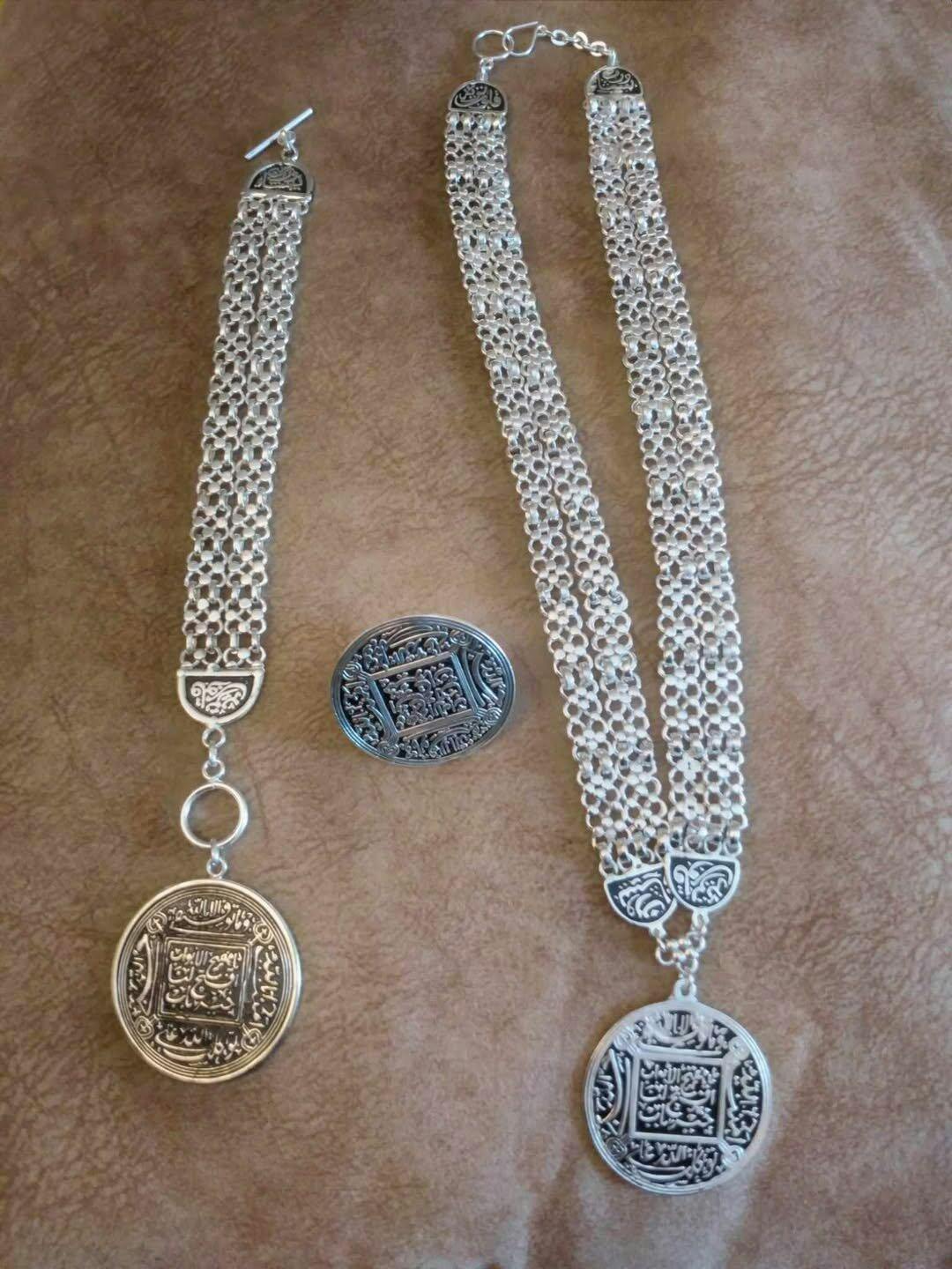 - Design: Circular medallion jewelry with intricate Islamic Arabic calligraphy