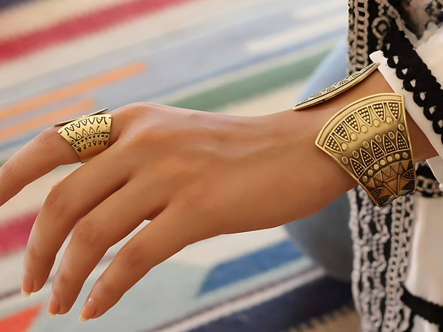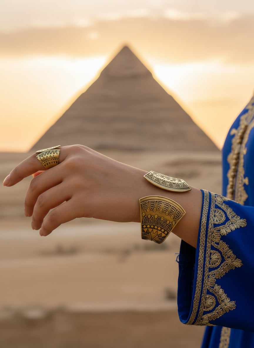 This design revives that ancient art, reimagined for the modern Egyptian woman who carries timeless grace and power. - Includes: A bracelet and ring set, each echoing the same temple-inspired pattern