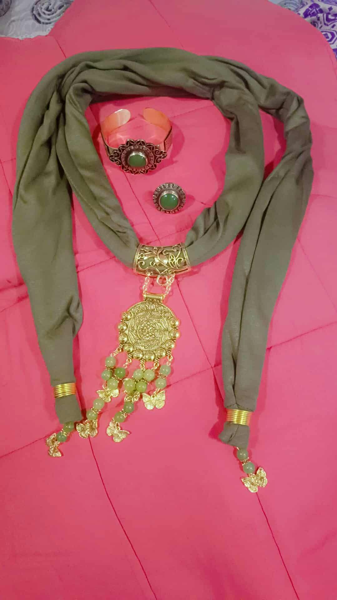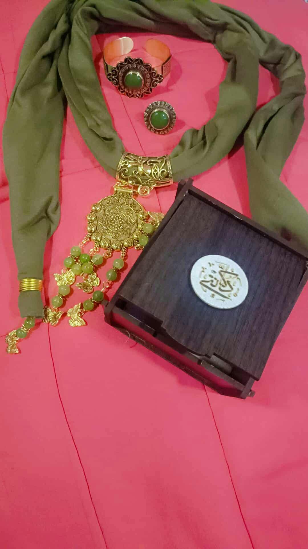 The olive green scarf wrap channels a grounded, natural vibe — symbolic of the desert’s vegetation and the Bedouin’s deep connection to the land. -