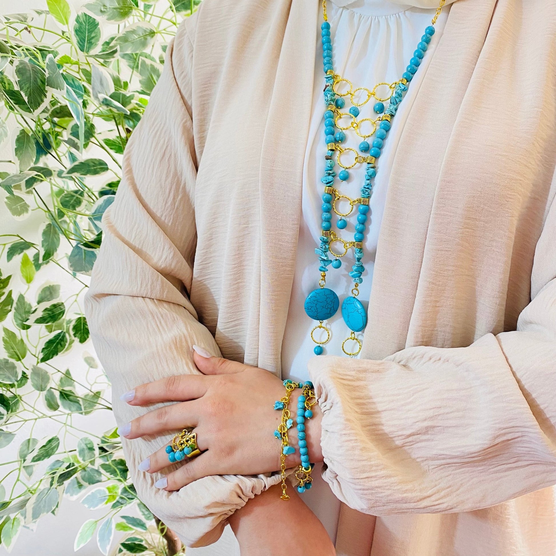 - Pairs beautifully with neutral tones, linen outfits, or abayas to highlight the turquoise brilliance.